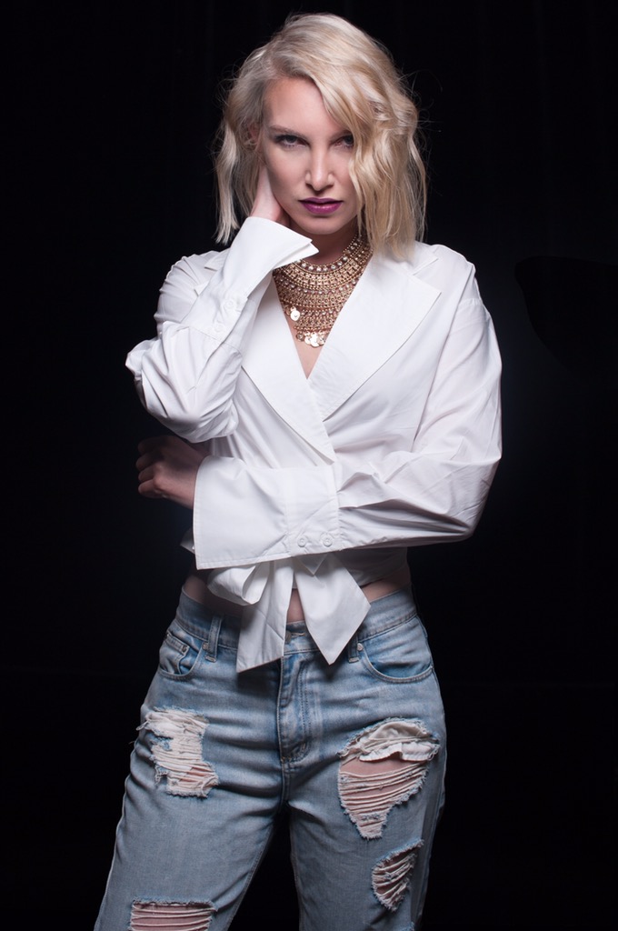 Wearing: the Barcelona Shirt from Samira’s ClosetSamira’s Closet, boyfriend-cut jean from Minkpink, necklace from Colette & Lipcolour by Gilded Cage in shade number 86.