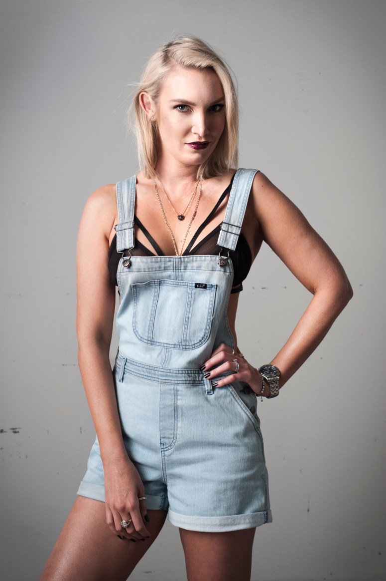 Wearing: Denim overalls – Lee Denim. Bra – Finders Keepers. Shoes – Mara and Mine. Watch – Omega 300m Sea-master Chronograph.